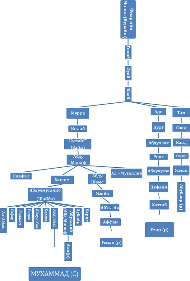 Ниже мы приводим генеалогическую таблицу родственных связей Посланника Аллаха (с), а также первых праведных халифов, составленную на основе мусульманских источников. Бану Курайш со времён Назра ибн Киноны – потомка Исмаила (а), Ибрахима (а), Сома ибн Нуха (а) управляли делами по благоустройству Каабы, следили за её порядком, кормили, поили паломников и владели ключами от дверей Каабы. Это переходило из поколения в поколение. Зайд, сын Килаба – продолжатель рода курайшитов – ещё ребёнком остаётся без отца. Его мать Фатима выходит замуж за другого и уезжает вместе с Куссайем из Мекки в Кузоа (Йемен)[36]. Повзрослев, Куссай принимает решение вернуть правление Меккой в свои руки и продолжить традиции предков. Вернувшись в Мекку, Куссай находит город под господством бану Хузоа. Куссай с ловкостью покупает у Сулеймана ибн Амра из бану Хузоа бразды правления Мекки и ключи от Каабы за бурдюк вина, впоследствии чего между двумя кланами, т. е. бану Кусайа и бану Хузоа, возникает стычка. С помощью своего брата – предводителя Кузоа, Рувоха Куссай одерживает победу над бану Хузоа и собирает воедино своё разбросанное племя. По Табари, «…до него [это племя] не называли Курайшем, и с того дня род Куссайа именовали Курайшем»[37].