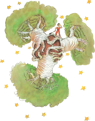 Я заметил, что баобабы – это не маленькие кустики, а совсем наоборот, деревья, размером с дворец; и что даже если он возьмет с собой целое стадо слонов, они все вместе не съедят и одного баобаба.