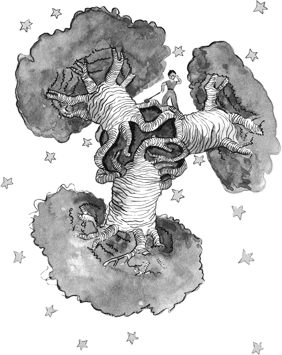 Выяснилось, что на планете Маленького принца, как и на всех других планетах, есть растения полезные, а есть вредные. И, соответственно, полезные семена полезных растений и вредные семена вредных. Но семена-то мы не видим. Они дремлют себе в земле, пока им не заблагорассудится проснуться. Тогда они начинают тянуться, поначалу робко, к солнцу, с виду эдакие нежные безобидные росточки. И если это ростки редиса или там розового куста – прекрасно, пусть себе растут на здоровье. Но если это растение зловредное, его нужно немедленно выполоть – как только вы его распознали. Так вот, на планету Маленького принца тоже попали зловредные семена… Это были семена баобабов. Потому что, если не распознать баобаб вовремя, то потом от него уже не избавиться. Он захватит всю планету. Пронзит ее насквозь своими корнями. И если планета совсем крохотная, а баобабов слишком много, они просто разорвут ее на части.