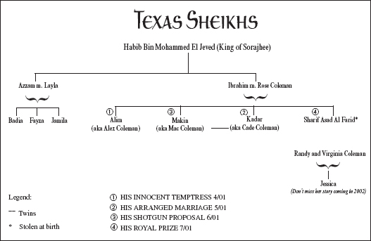 She knew the Colemans were expecting company, but when the other hands were speculating at breakfast that royalty was coming to visit, she’d thought it was a bunch of hogwash. Of course everyone knew that Alex, Mac and Cade were descendants of some Arab sheikh…as hard as that was to believe. She knew that Cade’s wife, Serena, was from the mid-East and that her father had visited once. But she didn’t think any more of those people would be coming here.