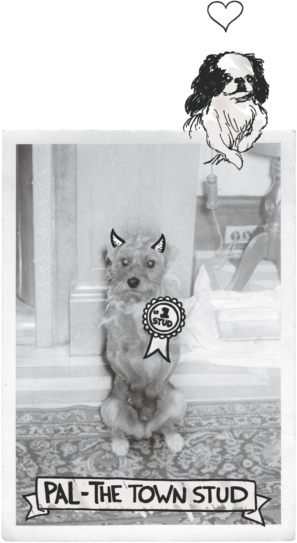 I had a dog named Pal. Some kind of terrier, brownish red, completely scruffy, with wiry hair, floppy ears, whiskers and a beard, and the most disgusting body. He was my dad’s dog really, but he was very independent. And wild—a real male dog that hadn’t been fixed. Pal was a stud. He would wander off and slink back after being gone for a week, completely exhausted from all these flings he’d had.
