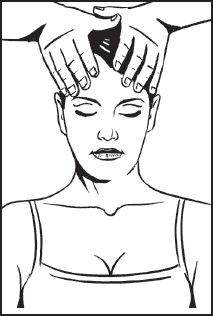2. Очень нежно расположите на лбу растопыренные пальцы рук, затем плавно двигайте руки к волосам, расслабляя все области напряжений.