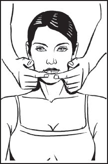 5. Сначала расположив два пальца над верхней губой, расслабьте этот участок. Затем таким же образом расслабьте участок под нижней губой. Тепло ваших пальцев эффективно воздействует на ткани лица.