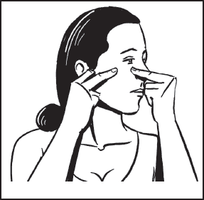 4. Положите палец одной руки на переносицу, пальцем другой руки выполните поглаживающие движения сверху вниз по носу и наоборот.