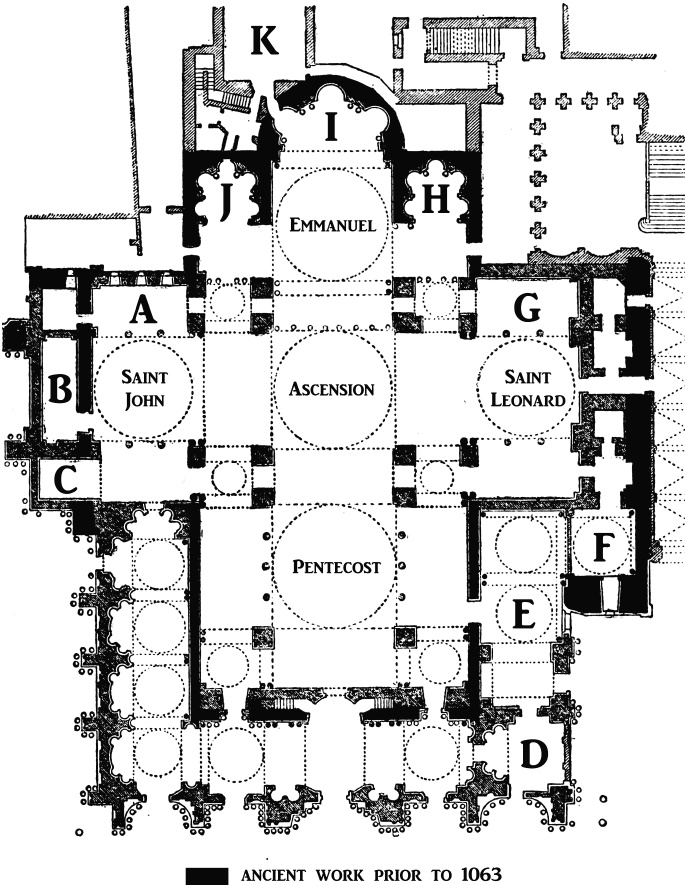 Каждое куполообразное пространство, по сути, образует отдельный греческий крест меньшего масштаба с четырьмя цилиндрическими сводами, распределяющих нагрузку купола. Преобладание общего плана греческого креста подчеркивается тем, что аркады отгораживают вспомогательные цилиндрические сводчатые пространства, которые также служат опорой для галерей. Нынешние приподнятые дорожки – это остатки первоначальных галерей. Кажется, что когда-то они были намного шире, как те, что сохранились на концах обоих трансептов и в западной части нефа, но впоследствии были сужены, чтобы пропустить больше света в проходы под ними. Существующие галереи ясно свидетельствуют об этом изменении, так как внешние балюстрады выполнены в массивном византийском стиле с рельефными панелями, а внутренние – типично готического стиля с рядами тонких колонн. Причиной переделки, должно быть, было загромождение многих верхних окон, чтобы обеспечить дополнительное пространство на стенах для мозаик, из-за чего в церкви было слишком темно.