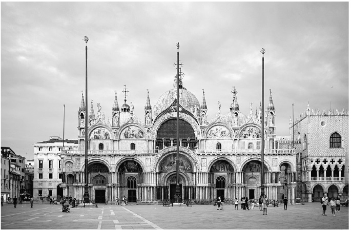 Чтобы представить себе Сан-Марко в том виде, в каком он был в IX в., историк архитектуры должен положиться на археологию. Однако внешний вид церкви XI в. можно относительно легко реконструировать по виду нынешнего здания. Необходимо, прежде всего, большое усилие воображения, чтобы стереть из памяти обилие мозаики, прекрасного мрамора и витиеватой скульптуры на крышах, которые теперь ее украшают – и в значительной степени скрывают этот великий венето-византийский памятник.