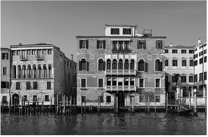 Сосуществование различных «ордеров» в отдельных зданиях также добавляет трудностей. Например, в Ка-да Мосто (позже ставшем домом великого венецианского исследователя XV в., а впоследствии – знаменитым трактиром «Остерия-дель-Леон-Бьянко») ныне фрагментарная венето-византийская аркада на первом этаже увенчана бельэтажем, соответствующим второй ступени Рёскина, то есть с небольшим перегибом на внешнем венце арки. Бельэтаж датируется второй четвертью XIII в. В этом случае кажется, что здание было перестроено с сохранением частей более старого византийского портика на набережной. Нижняя аркада, возможно, была перенесена вперед с более ранней планировки, поскольку ее части несколько неуклюже сочетаются друг с другом. Правая часть водного этажа и два верхних этажа являются более поздними вмешательствами.