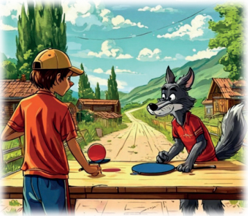 Саша, вспомнив финальную сцену одной из серий мультфильма «Ну погоди», подал мяч так, что Волк, пытаясь отбить, споткнулся и упал прямо в коляску мотоцикла, на котором мимо проезжал Печкин.