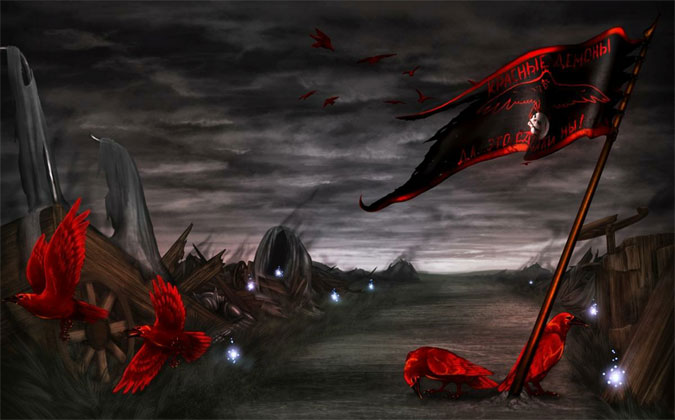 Для совсем уж идиотов, не знающих о подобных фирменных знаках и не способных оценить масштаб и величие содеянного, оставлен еще один большущий знак с недвусмысленной надписью. Только слепой не увидит – посреди места схватки, был вбит толстый кол из красной меди, на котором развевалось черное знамя с широкой кроваво-красной окантовкой. Из-за дальности расстояния я не видел деталей, но этого и не требовалось – я знал, что там изображено. Посреди флага – сидящий на окровавленном человеческом черепе черный ворон с широко раскинутыми крыльями. По верхнему краю флага, черными буквами на кровавом фоне надпись: «Красные демоны». По нижнему краю лаконичная надпись насмешка: «Да. Это сделали мы!».