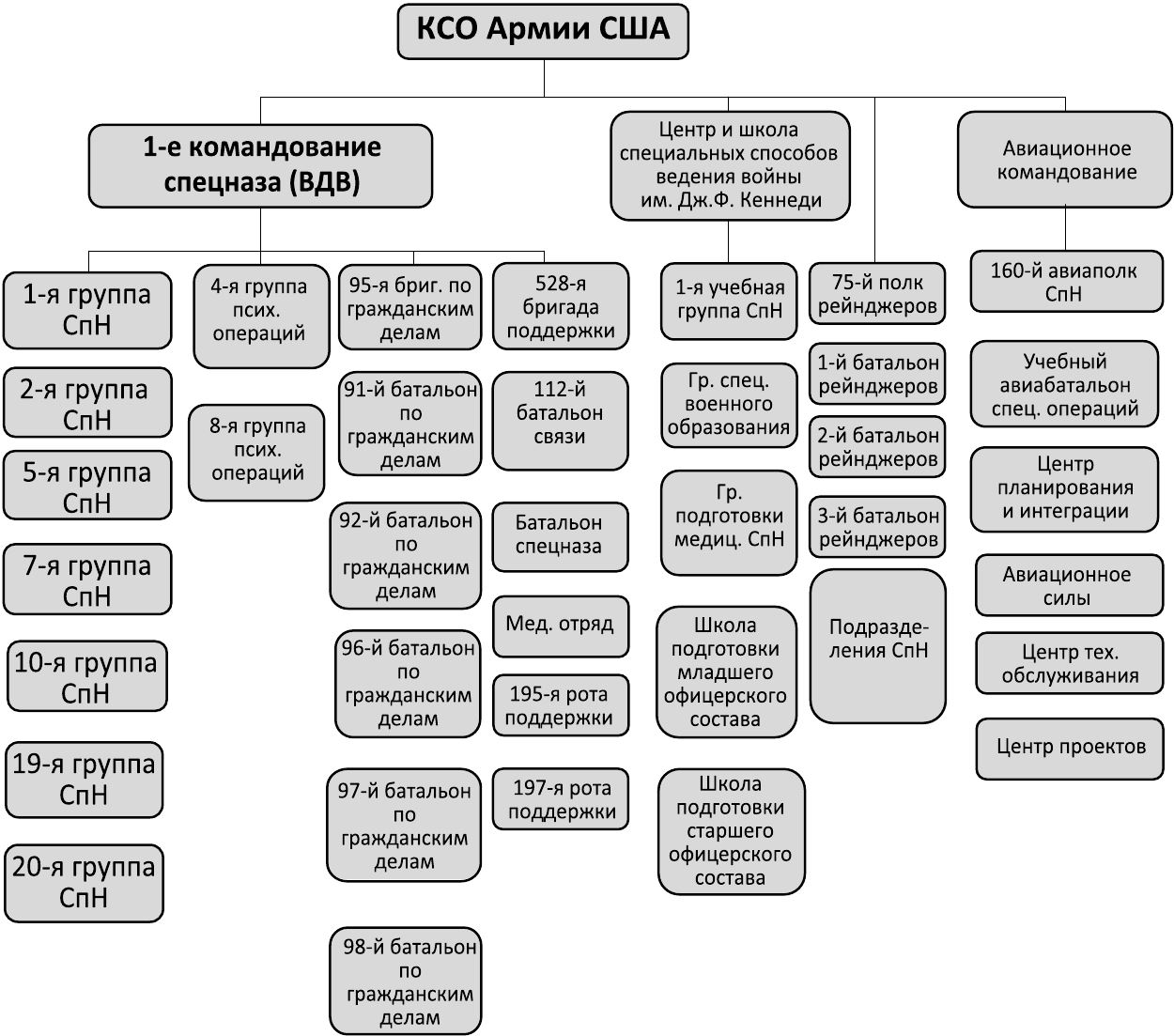 3) Командование специальных операций Армии США было создано 1 декабря 1989 г. и расположено в Форт-Брэгге. Его командующий – генерал-лейтенант Джонатан Брага4. Основные задачи КСО Армии США заключаются в комплектации, оснащении и обучении приданных сил для проведения специальных операций по всему спектру военных конфликтов в поддержку СКСО и союзников США, для достижения региональных и глобальных целей Соединённых Штатов. Численность личного состава составляет 36 тыс. человек5, проходящих службу в подразделениях: спецназа (СпН, «зелёные береты»), рейнджеров, в специальных аэромобильных группах, группах по военно-гражданским делам, подразделениях психологических операций, тренировочного персонала и служб поддержки.