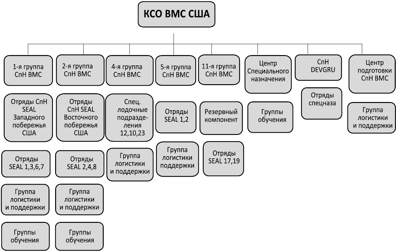 4) Командование специальных операций ВМС США было создано 16 апреля 1987 г. и расположено в Коронадо (штат Калифорния). В настоящее время командующим данной структуры является контр-адмирал Кейт Б. Дэвидс6. Основной задачей КСО ВМС США является оснащение, обучение и развёртывание вверенных ему подразделений для проведения операций прямого действия и специальной разведки, обеспечение программы консультирования и помощи, а также наращивание партнёрских возможностей в морской среде. В структуре служат 11 тыс. человек, которые задействованы в подразделениях «морских котиков», в экипажах боевых кораблей специального назначения и силах поддержки.