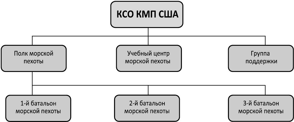 6) Командование специальных операций Корпуса морской пехоты США было основано 24 февраля 2006 г. и расположено в Кэмп-Лежене (штат Северная Каролина). Командующим в настоящее время является генерал-майор морской пехоты Метью Троллингер8. КСО Корпуса морской пехоты (далее – КСО КМП) состоит из представителей более чем 120 военных специальностей, объединённых в штаб-квартире КСО КМП, учебном центре морских рейдеров, Группе поддержки морских рейдеров и полку рейдеров морской пехоты, которые в рамках своей компетенции разрабатывают и проводят специальные операции. Посредством специализированной подготовки КСО КМП создаёт программы, интегрирующие личный состав, состоящий из операторов, специалистов по боевой поддержке и боевому применению спецназа, для выполнения поставленных задач. Численность личного состава – 3500 человек9, проходящих службу в качестве оперативников, аналитиков, специалистов обеспечения боевой службы.