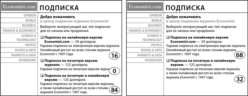 Что же заставило их изменить свое мнение? Уверяю вас, у этих действий не было рациональной причины. Именно наличие приманки заставило 84 человека выбрать двойную подписку. Когда приманка исчезла, их выбор изменился: 32 человека предпочли двойную подписку, а 68 – электронную.