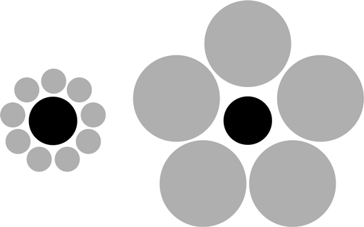 Как вы можете заметить, центральный круг изменяет свой размер. Когда мы помещаем его среди кругов большего диаметра, он становится меньше. Когда же он находится среди кругов меньшего диаметра – увеличивается. На самом деле в обоих случаях диаметр среднего круга остается неизменным, однако нам кажется, что он меняется – в зависимости от окружения, в котором находится.