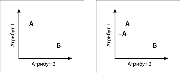 В левой части картинки мы видим два варианта, каждый из которых превосходит другой с позиции определенного атрибута. Вариант А лучше с точки зрения атрибута 1, например качества. Вариант Б – атрибута 2, например красоты. Очевидно, что эти два варианта в значительной степени различаются, и выбор одного из них представляется не таким простым делом. Давайте представим себе, что случится, если мы добавим еще один вариант под названием – А, или «минус А» (см. правую часть иллюстрации). Этот вариант очевидно хуже, чем вариант А, однако схож с ним. Это не только упрощает сравнение между ними, но и дает основания предполагать, что вариант А лучше не только варианта – А, но и варианта Б.