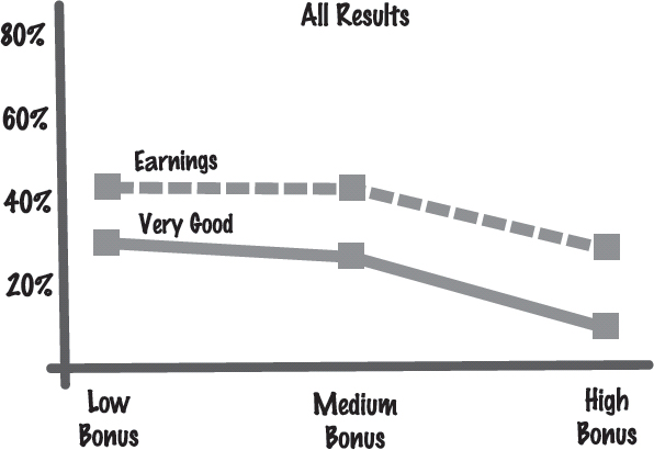 The graph below summarizes the results for the three bonus conditions across the six games. The “very good” line represents the percentage of people in each condition who achieved this level of performance. The “earnings” line represents the percentage of total payoff that people in each condition earned.