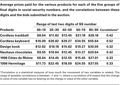 At the time, sitting before him were the 55 students from his marketing research class. On this day, Drazen, George Loewenstein (a professor at Carnegie Mellon University), and I would have an unusual request for this group of future marketing pros. We would ask them to jot down the last two digits of their social security numbers and tell us whether they would pay this amount for a number of products, including the bottle of wine. Then, we would ask them to actually bid on these items in an auction.