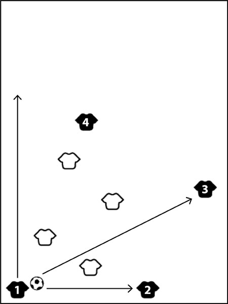 Схема 4.1. У игрока с мячом имеется 3 возможных вектора передачи. Нападающие № 2 и № 3 находятся в правильной позиции, а нападающий № 4 попал в мертвую зону позади двух защитников.