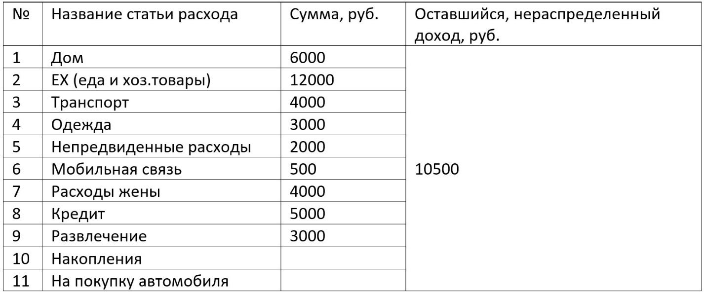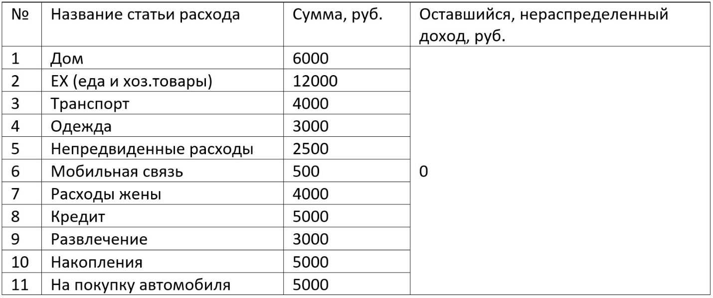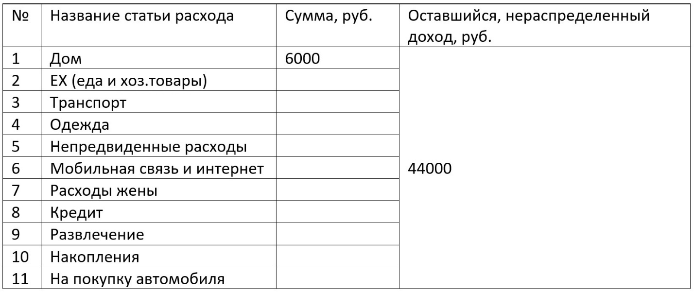 У гипотетического Ивана совокупный доход на его семью составляет 50 тыс. руб. (25 тыс. его зарплата и 25 тыс. зарплата жены). И он начинает составление бюджета семьи, заполняя статьи расходов. Он составил список и у него он получился следующим: