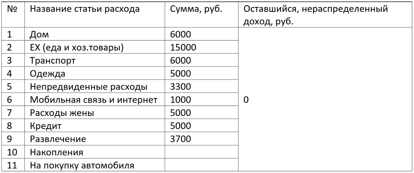После внесения первой суммы расходов, он вычел её из своего совокупного дохода и уже на этом этапе видит, что у него на остальные статьи осталось 50000 – 6000= 44000 руб. И Иван продолжает вписывать суммы по оставшимся статьям расходов.