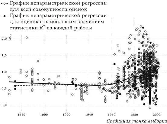 Дисдье и Хед провели мета-анализ, собрав 1467 наблюдений по эффектам расстояния из 103 работ, посвященных торговым потокам в различные моменты времени, и получили неожиданный результат: значимость расстояния в наши дни выше, чем в конце XIX в. Эффект расстояния, видимо, усилился с 1960‐х гг., оставаясь с тех пор стабильно высоким (см. рис. 2.4). Если угодно, глобализация, пожалуй, повысила то взыскание, которое географическое расстояние налагает на экономический обмен. Этот кажущийся парадокс подтвердили, кроме того, Матиас Бертелон и Кэролайн Фройнд, которые обнаружили повышение (абсолютной величины) эластичности по расстоянию с –1,7 до –1,9 между 1985 и 1989 гг., а также между 2001 и 2005 гг., используя внутренне согласованный набор данных по международной торговле. Бертелон и Фройнд показали, что данный результат обусловлен не изменением структуры товарных потоков (переходом от товаров с низкой эластичностью к высокоэластичным товарам), а «значительным и растущим воздействием расстояния на торговлю почти в 40% отраслей»48.