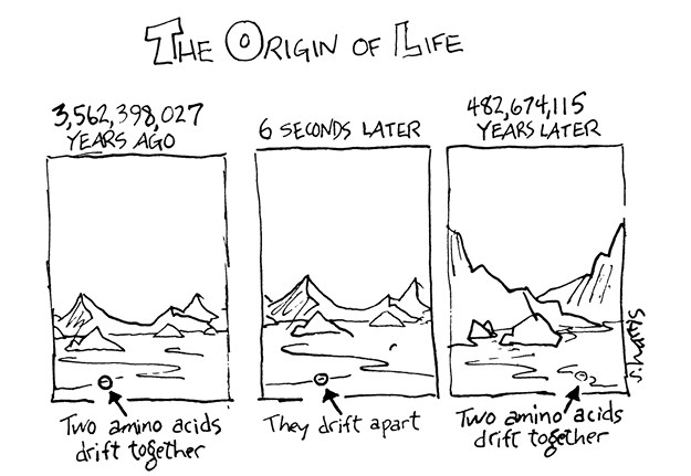 Но как этот процесс мог начаться? Дентон191 довольно много места отводит расчетам, доказывающим неправдоподобность такого происхождения жизни, и в итоге получает вполне подходящее для его целей огорошивающе громадное число: