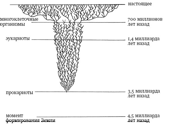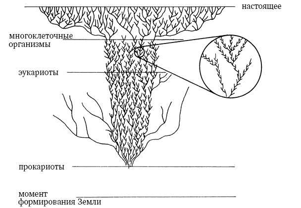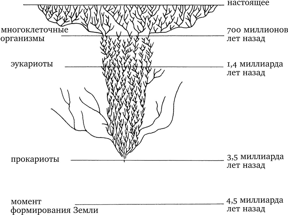 Представьте себе Древо Жизни – диаграмму, отражающую время существования каждого из существ, когда-либо живших на этой планете, – или, иными словами, общую последовательность линий наследования. Правила составления такой диаграммы просты. Отрезок, изображающий жизнь организма, начинается с его рождением, обрывается в момент смерти, и от него либо отходят другие отрезки, изображающие потомков, либо нет. Если повнимательнее посмотреть на эти отображения потомков (при их наличии), то окажется, что различия в их облике обусловлены несколькими факторами: происходит ли размножение делением или почкованием, путем откладывания яиц или рождения живых детенышей, и переживает ли организм родителя момент появления потомства с тем, чтобы продолжить существовать одновременно с ним. Но сейчас такие подробности в целом не будут нас занимать. В том, что все разнообразие жизни, когда-либо существовавшей на планете, может иметь один-единственный корень, нет существенного противоречия; противоречия связаны с тем, как, не вдаваясь в подробности, открывать и описывать различные силы, принципы, ограничения и пр., позволяющие нам давать научное объяснение существующим во всем этом многообразии закономерностям.