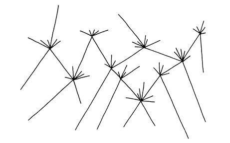 Много миллионов лет спустя выше, в ветвях нашего Древа, распространилось половое размножение (вероятно, эволюция приводила к его появлению неоднократно, хотя на этот счет и не существует единого мнения). Если мы приблизимся и внимательнее рассмотрим траектории развития отдельных организмов, то обнаружим иной вид связи между ними – спаривание, – в результате которого в стороны расходятся лучи жизненных траекторий потомков. Приблизившись и «рассмотрев картину в микроскоп», мы заметим на ил. 6, что, в отличие от сближения, приведшего к появлению эукариот, в результате которого в телах потомков сохраняются по отдельности обе последовательности ДНК, при спаривании у каждого потомка формируется собственная уникальная последовательность ДНК, сотканная из 50% ДНК одного родителя и 50% ДНК другого родителя. Разумеется, клетки организма каждого из потомков также содержат митохондрии, всегда заимствованные только из организма родителя женского пола. (Если вы – мужчина, все митохондрии вашего организма находятся в эволюционном тупике; они не будут переданы ни одному из ваших потомков, которые получат все свои митохондрии от матери.) Теперь отступим на шаг назад от нашего крупного плана, изображающего спаривание и появление потомства, и отметим (на ил. 6), что большинство траекторий этих потомков оборвутся, не приведя к спариванию или по крайней мере появлению следующего поколения. Это – мальтузианская катастрофа. Куда бы мы ни посмотрели, ветви и прутья покрыты коротким ворсом жизней, ни приведших ни к чему, кроме смерти.