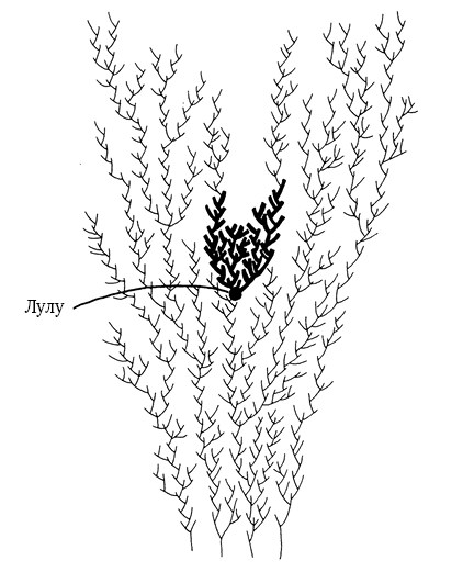 Существовали, должно быть, миллиарды таких неудачных конструкторских экспериментов, но, вероятно, ни один из них не отступал от единого нормативного образца одноклеточного организма слишком далеко. В любом случае, рассматривая ствол нашего Древа под большим увеличением, мы бы стали свидетелями резкого увеличения числа кратковременных альтернативных решений, как на ил. 5, практически незаметных на фоне нормального консервативного воспроизводства. Как мы можем быть в этом уверены? Можем, поскольку, как мы увидим, у любого мутировавшего организма шансы на выживание гораздо ниже, чем у прототипа, разновидностью которого такой организм является.
