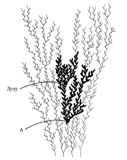 Со сходным затруднением мы сталкиваемся, когда пытаемся полностью выделить весь вид целиком, двигаясь вниз по Древу и помечая красными чернилами всех предков Лулу. На этом пути нам не встретятся ни разрывы, ни сочленения – можно без помех спуститься к прокариотам в корнях Древа. Но если мы будем не только двигаться вниз, но и смотреть по сторонам, отмечая тетушек и дядюшек, двоюродных братьев и сестер Лулу и ее предков, а затем раскрашивая эти боковые линии, то в конце концов красной станет вся ветвь, к которой принадлежит Лулу вплоть до того места, расположенные ниже (раньше) которого узлы (например, точка А на ил. 8), без сомнения, принадлежат к другим видам (если раскрасить их, красные чернила «протекут» на соседние ветви).