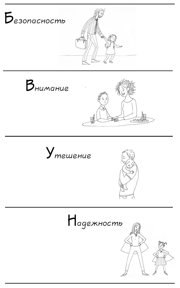 Когда опекун предсказуемо (пусть и несовершенным образом) заботится о воспитании ребенка, то последний с большой вероятностью преуспеет, даже несмотря на невзгоды. Предсказуемое воспитание, поддерживающее здоровые отношения, опирается на то, что мы называем «четырьмя чувствами» ребенка в процессе его развития. Ребенок ощущает (1) безопасность – то есть он чувствует себя защищенным от любого вреда; (2) внимание – он знает, что вы заботитесь о нем и уделяете ему внимание; (3) успокоенность, или утешение, – он уверен, что вы будете рядом с ним, когда ему плохо; (4) надежность возникает на основании предыдущих чувств, то есть ребенок понимает, что вы всегда будете помогать ему чувствовать себя «как дома» в окружающем мире, пока он сам учится обеспечивать себе безопасность, заметность и утешение.