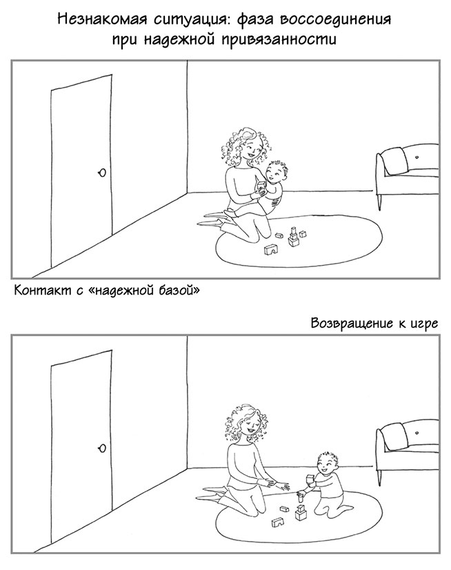 После многократных повторений этого исследования в разных культурах мы узнали, что ключевую роль в оценке взаимоотношений играет фаза воссоединения: реакция ребенка на возвращение матери. То, как быстро он успокаивается в ее присутствии и обращает внимание на игрушки, разложенные в комнате. (Потом этот эксперимент был проведен с участием отцов и в целом дал такой же результат, поэтому мы можем говорить о родителях в целом.) Младенцы с надежной привязанностью сразу же замечают отсутствие матери, когда она выходит из комнаты, активно приветствуют ее, когда она появляется, а потом быстро успокаиваются и возвращаются к своим занятиям.
