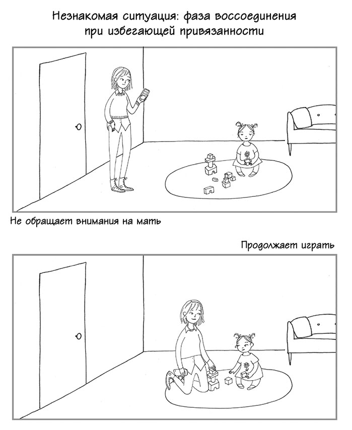Первая группа детей с ненадежной привязанностью при наблюдении в эксперименте «Незнакомая ситуация» демонстрирует избегающую привязанность. Когда мать оставляет их в одиночестве, они обращают все свое внимание на игрушки, которые находятся в комнате. В сущности, они почти не выказывают признаков расстройства или недовольства при отсутствии матери, а после ее возвращения не обращают на нее внимания или даже избегают ее.