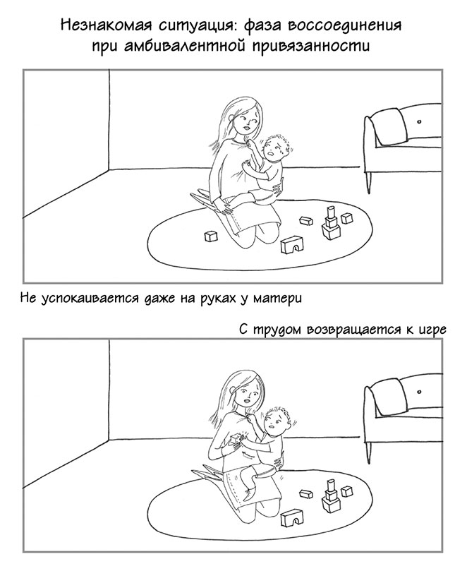 История непоследовательных отношений создает ощущение внутреннего смятения, а близкое присутствие матери после возвращения как будто усиливает тревожную неопределенность. В то время как ребенок с избегающей привязанностью отвлекается от физического присутствия или отсутствия матери и переносит внимание на игрушки, сводя к минимуму естественную потребность во внешней заботе, ребенок с амбивалентной привязанностью боится отвлечься от материнской близости, опасаясь ее ухода, пока он будет смотреть в другую сторону. Таким образом, выражение его потребности становится гипертрофированным.