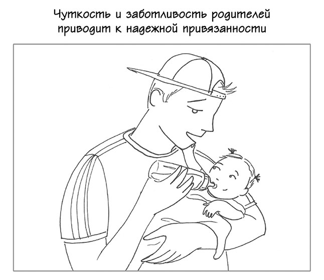Дети с надежной привязанностью встречают чуткую реакцию на стремление к близости, а неизбежно возникающие обиды всегда заглаживаются. Их потребности учитываются, оцениваются и удовлетворяются по мере возможности. Родители всегда находятся где-то рядом. Например, если четырехмесячная девочка плачет и отец это слышит, он бросает свои дела, берет ее на руки и спрашивает: «Ты проголодалась?» Потом он заботливо кормит ее.