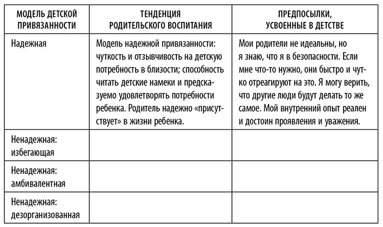 Психологи изобрели названия для категорий привязанности у взрослых людей, соответствующие категориям детской привязанности. Когда мы будем обсуждать каждую из них, постарайтесь выделить ту, которая наиболее соответствует вашему собственному жизненному опыту. Подумайте о своей истории привязанности с раннего детства и о том, какую роль она сыграла в вашей зрелой жизни. Вы можете пользоваться этой информацией для лучшего понимания партнера или друзей. Вы можете иметь это в виду при выборе сиделок и других опекунов и, возможно, даже при выборе учебного заведения для ребенка.