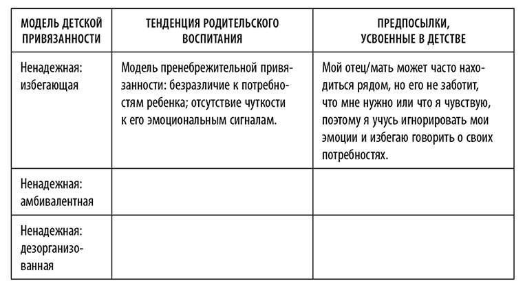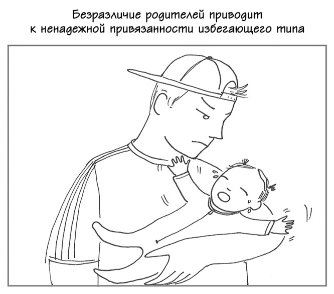 Чему учится младенец после неоднократных подобных взаимодействий, когда отцовская реакция на плач оказывается такой замедленной и настолько далекой от подлинных чувств и потребностей ребенка в настоящий момент? Тому, что отец плохо считывает ее сигналы. Если это происходит регулярно и почти постоянно, девочка понимает, что отец не в состоянии удовлетворять ее потребности или устанавливать эмоциональную связь с ней. Со временем она может прийти к убеждению, что никто на самом деле не может понять ее на глубинном уровне, что родители не замечают ее настроения и что она не может рассчитывать на то, что другие люди буду заинтересованы в ее чувствах и потребностях. В конце концов, ради адаптации к окружающей среде и получения более позитивной реакции от опекунов, она учится избегать эмоций, пренебрегать ими и важностью взаимоотношений. Иными словами, если в прошлом близкие отношения были бесполезными, то почему она должна полагаться на них, чтобы обеспечить надежное существование в будущем?