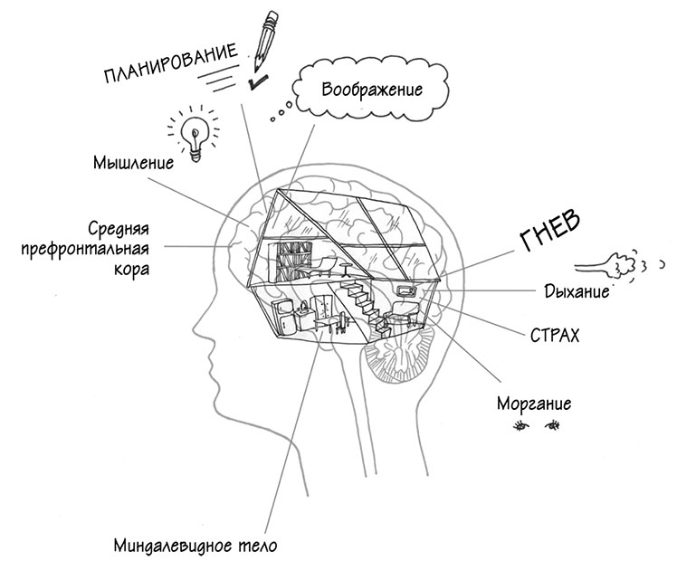 Имейте терпение, пока мы будем излагать некоторые основы нейронаук, объясняющие, как детский мозг может адаптироваться подобным образом и научиться избегать эмоций. Вы можете представить мозг как дом с верхним и нижним этажом, каждый из которых связан с определенными способностями и обязанностями. Нижний «этаж» состоит из ствола мозга и других нижних частей, включая лимбическую систему, управляющую основными побуждениями и эмоциями. Этот нижний мозг является источником самых примитивных и инстинктивных процессов, таких как телесные функции, внутренние побуждения и сильные чувства. Верхний «этаж» состоит из префронтальной коры головного мозга и других высших отделов. Это наиболее развитая часть мозга, отвечающая за комплексное мышление и непосредственно связанная с воображением, принятием решений, сопереживанием, личной интуицией и нравственностью.