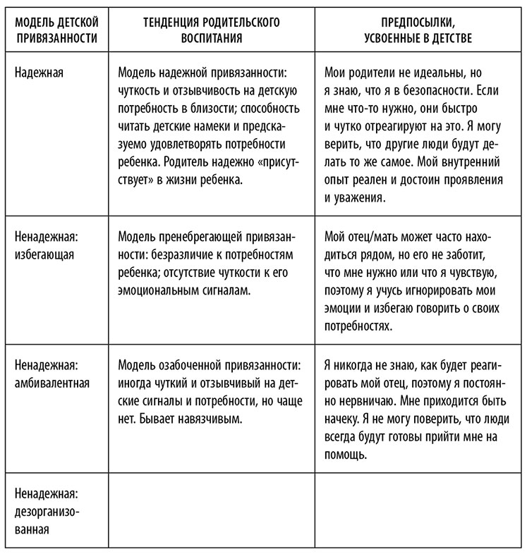 Последний вид ненадежной привязанности – дезорганизованная привязанность – является наиболее тревожным для развития ребенка. Он возникает, когда вместо того, чтобы создавать у ребенка ощущение безопасности, родители (или один из них) превращаются в угрозу. Из-за регулярных случаев ребенок воспринимает родителя как источник страха, если его поведение становится крайне пренебрегающим (а потому пугающим), непредсказуемым, ошеломительным, угрожающим или даже агрессивным и опасным. Страх перед опекуном приводит маленькую девочку к тому, что в зрелом возрасте ей очень трудно управлять своими эмоциями и ощущать себя в безопасности. Другие виды ненадежной привязанности (избегающий и амбивалентный) приводят к формированию организованных моделей поведения, позволяющих ребенку ориентироваться в окружающем мире. Взрослые люди с пренебрегающей моделью привязанности избегают эмоциональных связей и душевной близости из-за избегающих отношений со своими родителями. Взрослые люди с озабоченным типом привязанности склонны регулярно испытывать расстройство и смятение, изо всех сил пытаясь уменьшить тревогу и неопределенность, которую они чувствуют в своих отношениях. Ключевой пункт состоит в том, что минимизация привязанности в модели избегания/пренебрежения и максимизация ее в модели амбивалентности/озабоченности совместимы с организованной стратегией выживания, которая является внутренне согласованной, даже если не самой надежной или оптимальной.