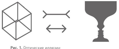 Когда мне было десять лет, самым завораживающим для меня предметом в доме была книга об оптических иллюзиях. Она познакомила меня с линиями Мюллера-Лайера, выглядевшими из-за стреловидных концов разными по длине, хотя при измерении линейкой они оказывались одинаковыми; с кубом Неккера, который казался открытым то сверху, то сбоку; с кубком, внезапно превращающимся в два силуэта, а потом – снова в кубок (рис. 1). Я часами сидел, разглядывая их, на полу в отцовском кабинете, загипнотизированный тем, как эти простые рисунки заставляют разум верить в заведомо неверное положение вещей. Тогда-то я и понял, что ошибки – это интересно и что в жизни для них тоже может найтись место. Однако главная привлекательность оптической иллюзии заключается не в том, что она заставляет каждого человека совершать ошибку, а в том, что она заставляет каждого совершать одну и ту же ошибку. Если бы я увидел кубок, вы – лицо Элвиса, а наш друг – просто какие-то каракули, то рисунок можно было бы назвать вполне замечательной кляксой, но никак не оптической, пусть и плохонькой, иллюзией. Иллюзия особенно притягательна тем, что каждый человек видит сначала кубок, потом силуэты, а потом – неуловимое движение и… снова кубок. Ошибки восприятия, порождаемые оптическими иллюзиями, закономерны, постоянны и систематичны. Это не глупые, а умные ошибки – они позволяют тому, кто их понял, разглядеть изящную конструкцию и внутреннюю работу зрительной системы.