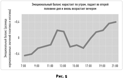 Оказалось, что тональность разговоров на телеконференциях, проводившихся с самого утра, была достаточно бодрой и оптимистичной. Однако позже по ходу дня общий настрой «становился более негативным и менее решительным». После ланча настроение слегка поднималось: как предположили ученые, это могло быть связано с тем, что участники успевали перекусить и восстановить эмоциональные и умственные силы. Но во второй половине дня негатив вновь усугублялся, и настроение начинало улучшаться только с закрытием биржевых торгов. Более того, закономерность была налицо «даже с учетом таких переменных, как отраслевая специфика, финансовый кризис, возможности роста и новости, касающиеся конкретных компаний»{13}. Другими словами, даже когда исследователи исключали влияние таких факторов, как макроэкономические новости (например, замедление экономического роста в Китае, сдерживающее экспорт компании) или показатели конкретной фирмы (скажем, низкую квартальную прибыль), тон послеобеденных телеконференций по сравнению с утренними «оказывался более негативным, раздраженным и воинственным»{14}.