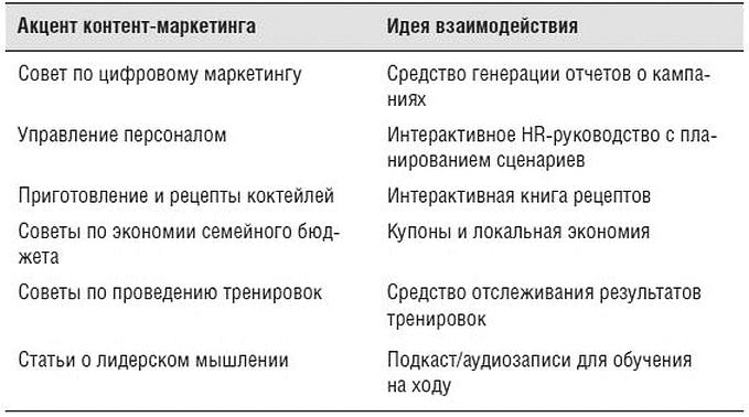 В таблице 2.3 рассмотрим, как можно применять идеи тем контент-маркетинга в интерактивном режиме.