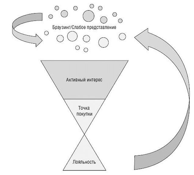 Традиционная воронка продажВоронка продаж показывает, как целевая аудитория, которая сначала не намерена что-либо покупать или имеет слабое представление о теме, движется через активный интерес к фактической точке покупки и, наконец, к этапу потенциальной лояльности (рис. 2.1).