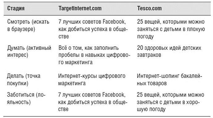Есть две очень непохожие друг на друга компании: TargetInternet.com (B2B-компания, продающая доступы к онлайн-курсам по цифровому маркетингу) и Tesco.com (международная торговая интернет-сеть розничных продаж бакалейных товаров). В таблице 2.4 представлены четыре стадии пути потребителя, а также примеры контента для каждой стадии в расчете на конкретную аудиторию.