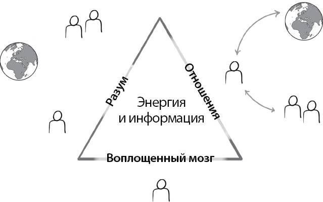 Тут нужно задуматься не только о понятии «разум», но и о связанном с ним понятием «я». Мы часто считаем себя «продуктом разума» или чем-то, что ограничено нашим телом. Отвечая на вопрос «где находится ваше “я”?», люди укажут на свою голову, или на сердце, или на все тело. Это так, мы находимся там, где находится наше тело. Но рассматривая разум как эмерджентный феномен, мы понимаем «я» как нечто большее. Обсуждая паттерны энергетического потока в отношениях, мы предполагаем, что может быть «я» вне тела.