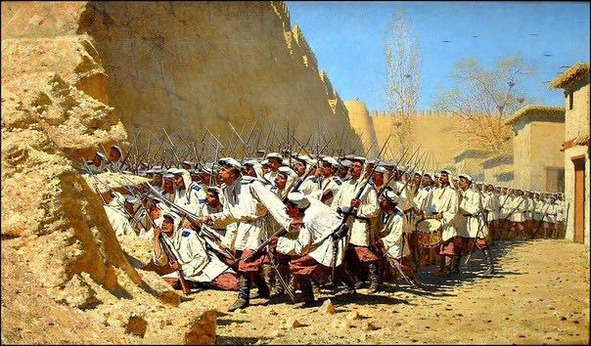 Интересный случай произошел в начале мая 1868 года во время Туркестанского похода русской армии. Четырехтысячный отряд генерала Кауфмана на подступах к Самарканду вступил с бой с шестидесятитысячной армией бухарского эмира Музаффара. Во время боя пехота генерала Головачева прямо на глазах у неприятеля по грудь в воде перешла реку Зеравшан и в смелой штыковой атаке заняла высоту Чапан-Ата. Войско эмира обратилось в бегство, но самаркандцы закрыли ворота перед бегущими и сдались русским.