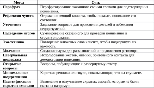 Безусловно одним из важнейших методов работы с запросами клиентов в консультации является метод активного слушания. Разберем его более подробнее.