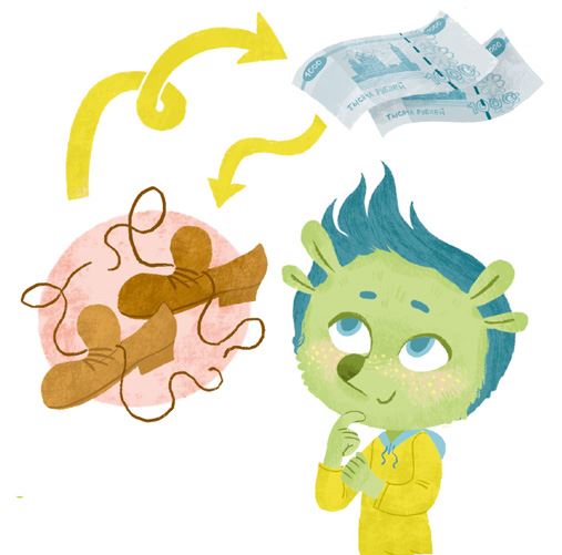 – Это очень правильный вопрос. Дело в том, что товаров в мире ограниченное количество. Видишь вон те модные кроссовки на витрине? Если все люди, которые сейчас находятся в торговом центре, захотят взять эти кроссовки, то их на всех не хватит. Да и как определить, кому они достанутся? Поэтому всё устроено так, что кроссовки купят те люди, которые отдадут за них нужное количество денег. Цена, как правило, указана на ценнике рядом с товаром.