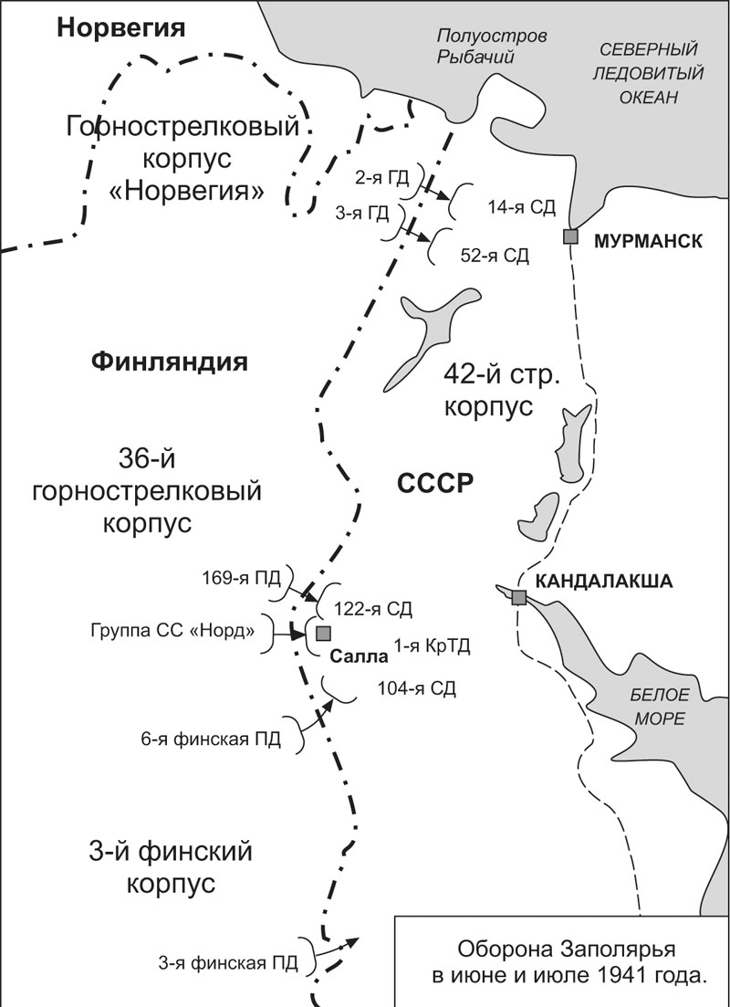 Для решающего удара в сторону Кандалакши немцы сосредоточили у границы под Саллами 36-й горный корпус генерала Ганса Фейге в составе: 169-й пехотной дивизии (378, 379 и 392 пехотные полки), боевой группы СС «Норд» (с сентября 1941 года дивизия СС «Норд») (6-й и 7-й полк), 211-го отдельного танкового батальона и части сил 40-го отдельного танкового батальона.