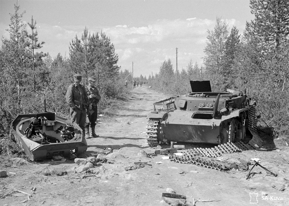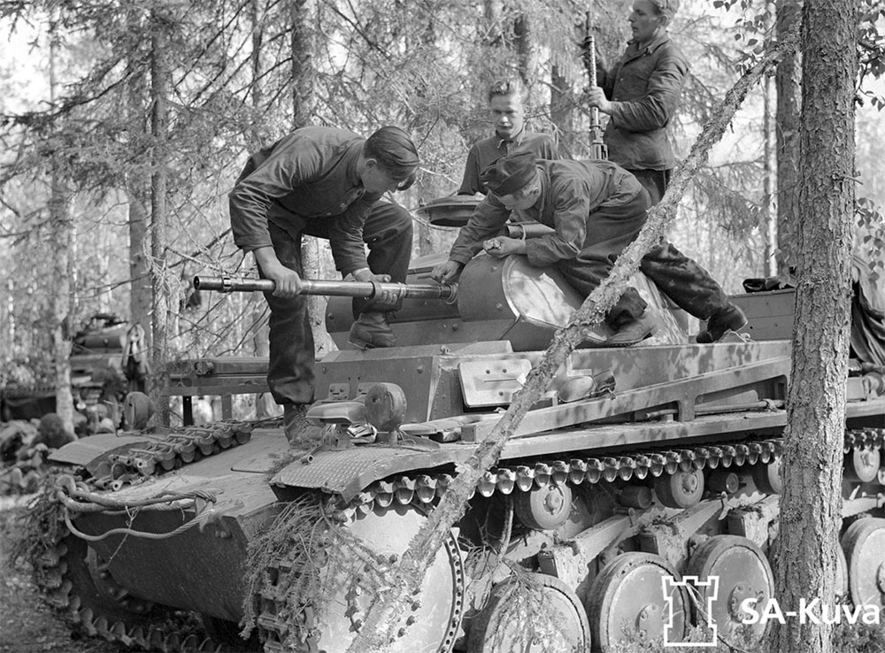 Немецкие танкисты 3-й роты 40-го отдельного танкового батальона проверяют пулемет и 20-мм пушку у танка Pz.II. 3-я рота не принимала участие в Салльском сражении, она поддерживала финские войска в 70 км от Саллы (фото CA-Kuva).